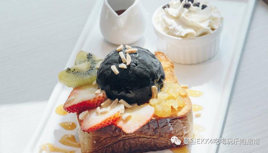 在Thonglor这个第一家独立咖啡厅,他们出了很多新品,包括椰子松饼(B80)、烤面包(B125)、三明治(热狗面包夹3勺冰激凌,B99)、椰子affogato(你可以选择在冰激凌上加意式浓缩咖啡或是泰国茶,B90)和其他软饮(B120)。