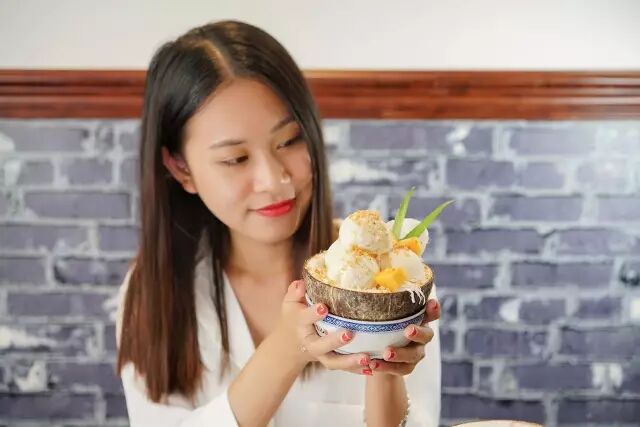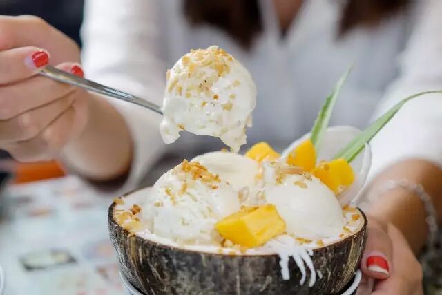 风靡海外的“传奇甜品”椰子冰激凌主要由椰子汁制成,配以一定量的牛奶 炼乳 奶油。清凉爽口,入口即化。通常选用椰子壳做容器,别有风味。