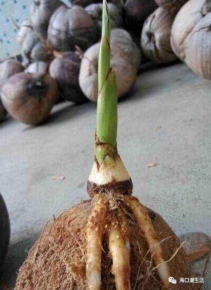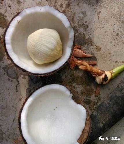 老椰子发芽了,椰子内会长出白色或浅黄白色的椰肉球体,叫椰子心,而这种椰子名为长芽椰。长芽椰就是长出椰芽叶子和椰根的椰子。每一个椰子都是一颗种子,放久后,从椰子下端的3个洞中,会有一个洞中长出根及叶芽。这个时候椰汁已经不再存在,完全形成养分,在中心长成一个海绵一样的椰子心,同时椰肉也将部分养分长到了椰子心中。椰子心香甜,状如海绵,奶香扑鼻,靠近椰宝处形成一层椰油结晶,再外面是变薄了很多的椰肉,十分好吃。