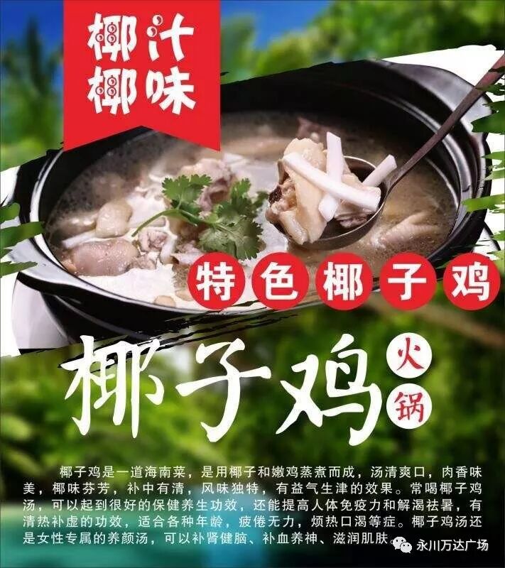 鸡肉均当天现杀直达店内,充分保证了鸡肉的新鲜海南特色融合重庆风味,让在喝汤养生的同时也能体验重庆的鲜香麻辣。