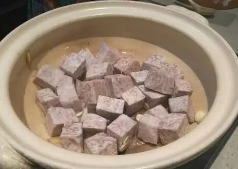 7、翻炒均匀,椰奶经过和虫草花的融合变成金黄色,均匀的分布在香芋的上边。