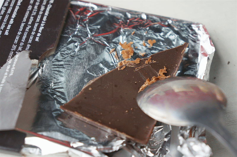 当然,目前这杯饮品只能达到营养的标准,谈不上高逼格。为此,我又准备了一块黑巧克力,打算弄点巧克力粉撒上。没有专业的工具不要紧,聪明的头脑告诉我,可以用勺子或椰子汁上的易拉环,像这样反方向一点点的刮。