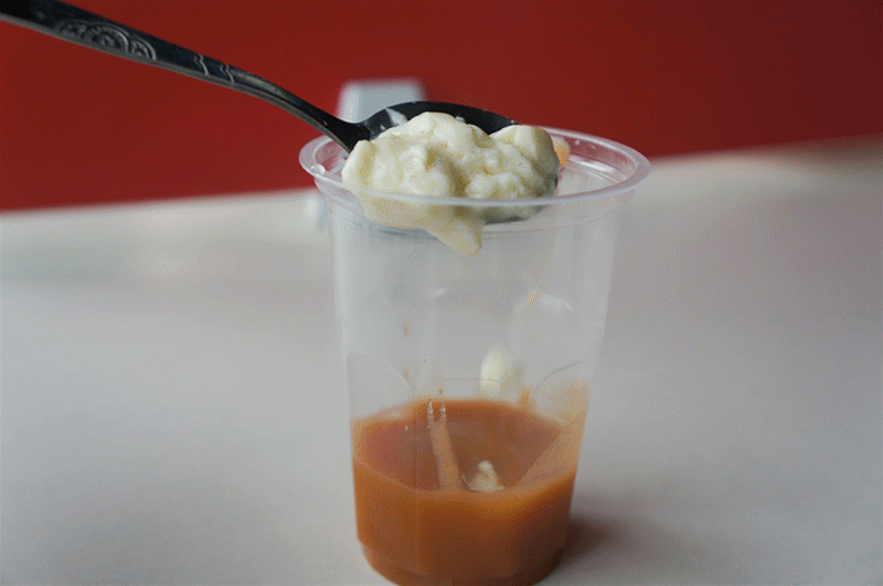 出现这个状况请允许我说明一下,M豆刚都进去的时候就非常配合的在融化,等再把巧克力抛进去的时候,已经差不多成了这样,不能怪我~但味道绝对没有受影响,椰子汁的香甜带着一丝丝巧克力的醇厚,成功改变豆腐脑的味道,成为当之无愧的味道之王。还有就是,这个事情告诉我们,美好的事物是需要承托的,就像下面这个。