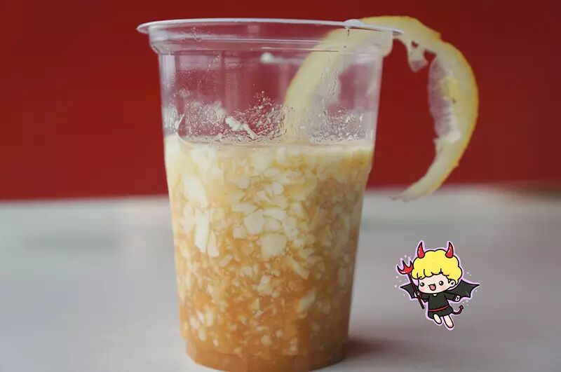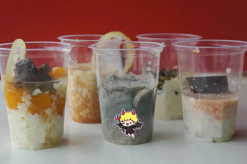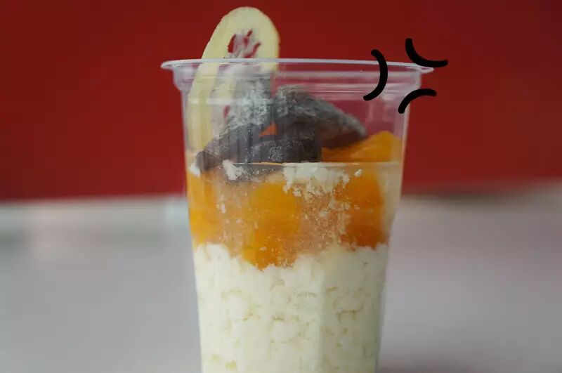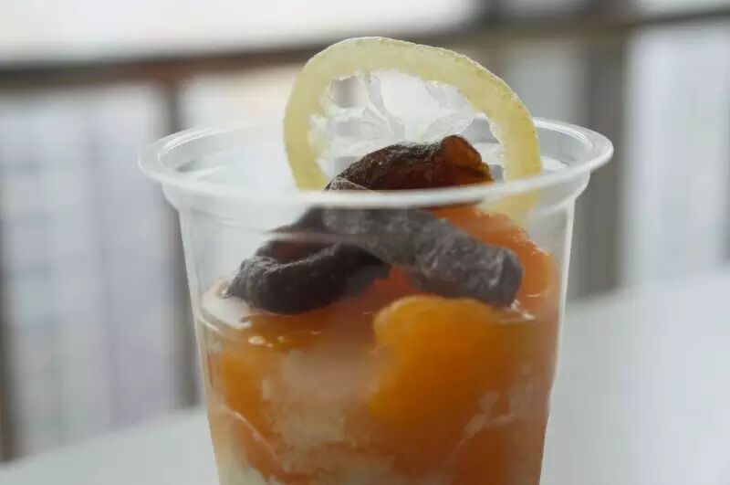 接着就是重复前面的步骤,舀豆腐脑,加果肉,为了让整体在视觉效果上更突出,除了给足一定分量的橘子外,还加了一些话梅,最后用一片柠檬收官,简直堪称完美!