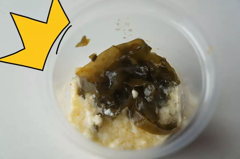 为避免出现上面那种分出花的情况,这一次绝对不搅拌,但依旧可以发现海带顺着水的纹路,慢慢下沉,海带上携带的辣椒汁也一点点晕开在豆腐脑上。