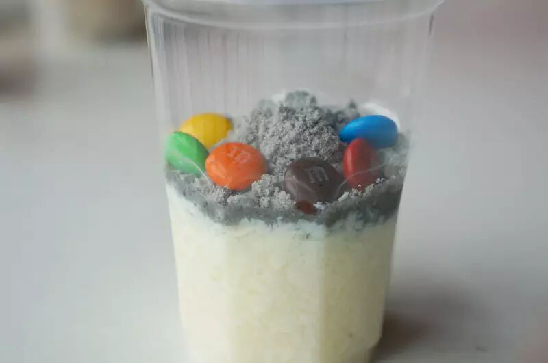 这是倒入适量黑芝麻粉之后的样子,灰白之间泾渭分明,带着一点点的小高冷,但丝毫不影响它的颜值,在此基础上再摆上几颗颜色丰富的M豆,瞬间就有了活力。