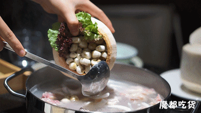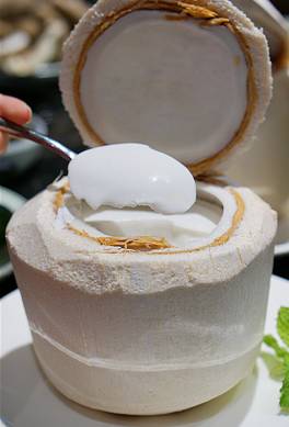 和一般的火锅不同,椰子鸡火锅的锅底就是来自海南的纯天然椰青原汁,在最底部还铺着一些鲜椰肉。