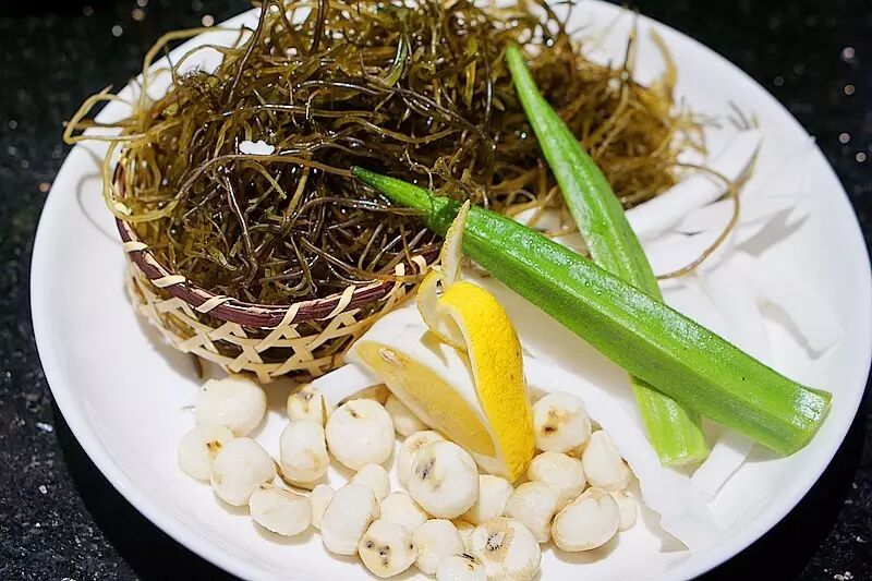 一份海南特色野菜拼盘就可以吃到各种来自海南的新鲜时蔬,除了野生珍珠马蹄、秋葵,还可以吃到含有丰富营养的海菜。虽然长得像海草,但是吃起来的口感却是十分柔滑清香,炒鸡好吃!