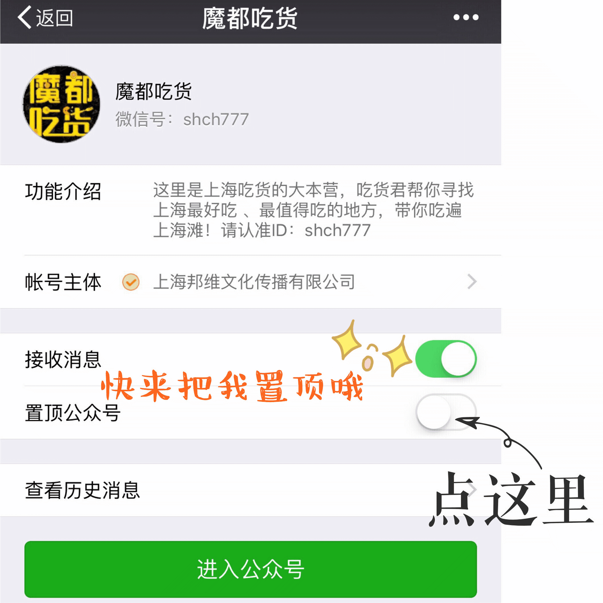 吃货们,公众号有置顶功能咯,喜欢吃别忘记将魔都吃货置顶哦,这样每天的美食福利就不会错过啦,简单两步看操作!你也可以找吃货君个人微信mdch777或文末评论,聊聊吃货经!