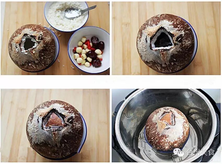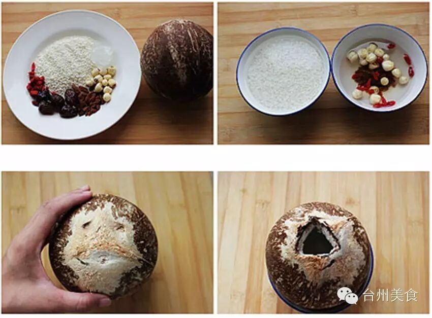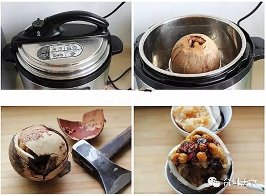 10.蒸好后的椰壳很好切,切开,就可以享用美味啦。