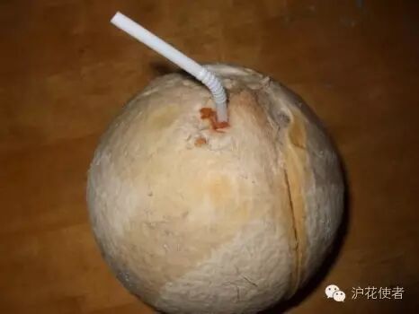 (4)找到椰子的圆点,然后就用小尖头的工具轻轻一捅就能看到椰肉,再用吸管轻轻一戳就能喝到美味的椰汁。