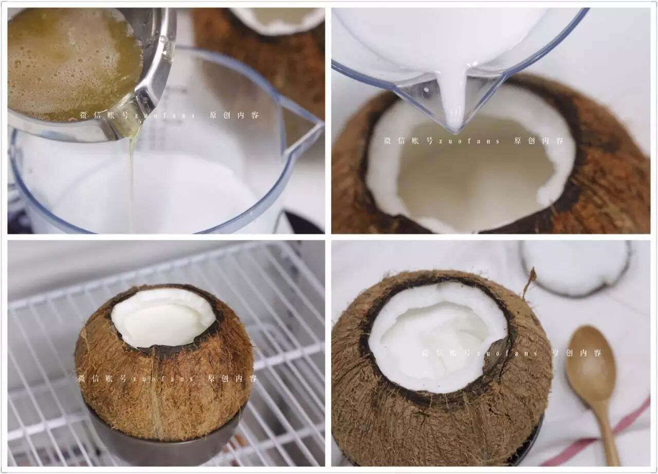 ⑥ 处理好的椰浆倒入椰子里,倒至9成满即可;