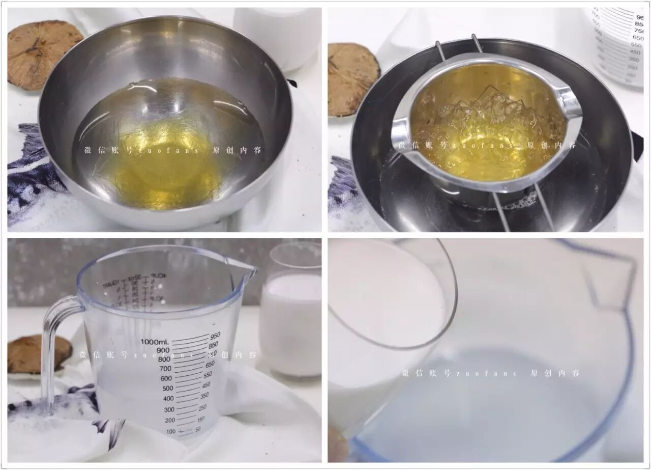 ② 取出泡软后的吉利丁片,隔热水融化成水;
