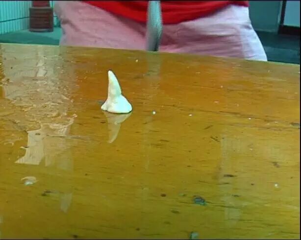 接下来记记者决定用椰子的底部试试。椰子砸下后,椰壳底部瞬间被戳出了一个大窟窿,椰汁倾泻而下。更让人感到不可思议的是,软软的口香糖竟然如同钉子一般立在桌面,丝毫没有变形。那么这到底是什么原理呢?难道是口香糖和椰子之间起了化学反应?又或是椰子本身有问题?
