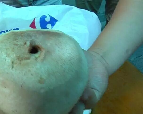 记者发现:侧面扎不穿,但是底部扎得穿。用菜刀把椰子砍开后,发现椰子壳确实底部是最薄的,中间厚点。
