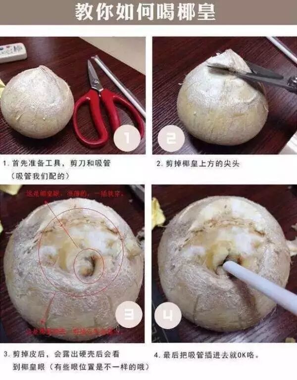 2.如何挑选椰子呢?椰子的外皮是一层很好的保护伞,能保护好椰子的味道,失去这层保护椰子很容易就不新鲜了,所以尽量挑选有完整外皮的椰子。即使有完整外皮,椰子也是要挑的。把椰子靠近尾巴的地方抠一下,如果里面已经干枯,就是老椰子了,如果还有水分,就是新鲜的椰子,另外,新鲜椰子顶端的三棱稍结实。把椰子拿起来摇一下,能听到水声的,就是放久的椰子或者老椰子,新鲜椰子摇起来是听不见水声的,只是清脆的声音。最后就是椰汁了,新鲜椰汁几近透明,香味四溢。变坏的椰汁,有强烈酸味,汁液中呈凝固状。