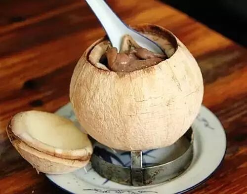 海南椰子盅为海南风味小吃,椰子原肉造型,汤鲜味美,椰香浓郁,营养丰富。可以说,海南椰子盅是到海南不得不吃的美食之一。据介绍,做汤底的椰子要求也很非常高,椰子全是新鲜的,大小也是整整齐齐的,不能太大,也不能太小,太大椰子汤不入味,太小椰子量太少,真是用料非常的讲究。
