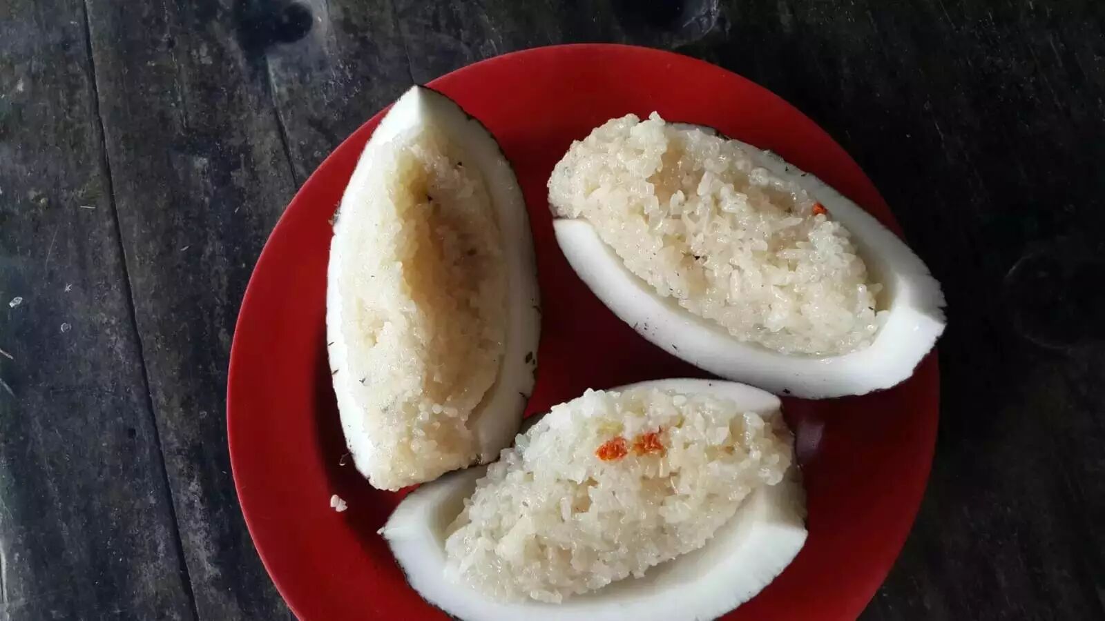 “椰子饭”又名椰子船。在海南的民间食品中,椰子饭是一种极为独特的食品,是由海南优质糯米、天然椰肉和椰汁一同蒸熟而成,是海南传统农家小吃。椰肉和糯米饭紧密结合,色泽白净,饭粒晶莹半透明,状如珍珠(故有“珍珠椰子船”之称)。硬软相间,脆糕结合,慢品细嚼,椰香浓郁,清甜爽口。