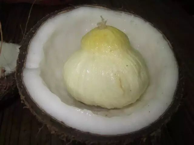 如果我们不去干扰椰子生长的话,椰子中会长出(如下图)一个大大的白色球状物。对椰子来说,那才是最珍贵的部分——胚。据说椰子的胚也有清甜脆爽的口感,但是要想吃到全靠碰运气。因为一来这种子活力要够好,二来要给它们一个良好的萌发环境。不妨买个成熟的椰子来照顾一下,体验一下椰子胚的特殊口感吧。