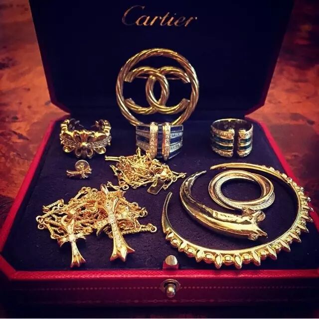 手上戴满了宝格丽卡地亚,脖子上挂满了克罗心Goros,钱包是Fendi的,眼镜是TOM FORD的,手表是米勒的,腰带是LV的。