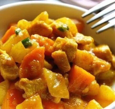 再将腌好的鸡肉、马铃薯、红萝卜入锅,