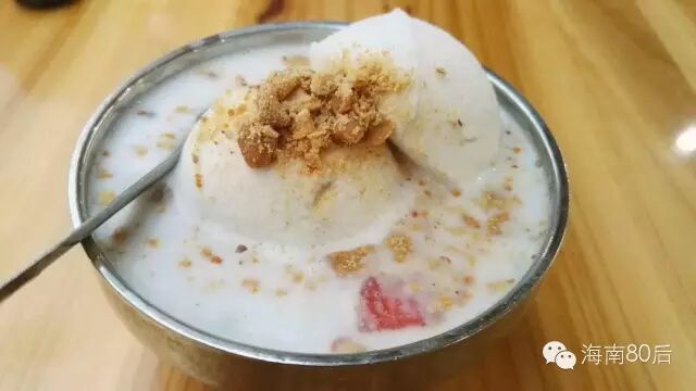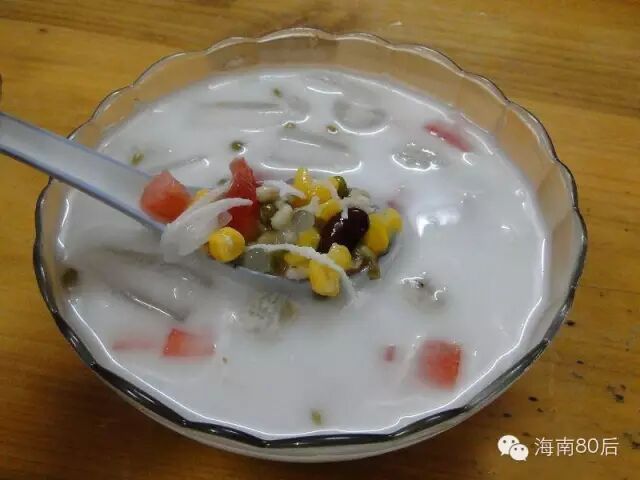 接下来要推荐的就是众望所归的清补凉啦。清补凉是风靡海南岛的特色冰爽甜品,可以说它是海南甜品之王。海南清补凉主要是以红豆(绿豆)、薏米、花生、空心粉、椰肉、红枣、西瓜粒、菠萝粒、芋头、冬瓜薏、鹌鹑蛋、凉粉、椰奶等多种配料炮制而成的冰爽又解渴的小吃。夏日的夜晚,海南清补凉是岛上一道很独特的风景线。