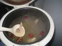 1. 鸡块去皮,猪骨处理干净,切姜三片一起备用;红枣去核备用;