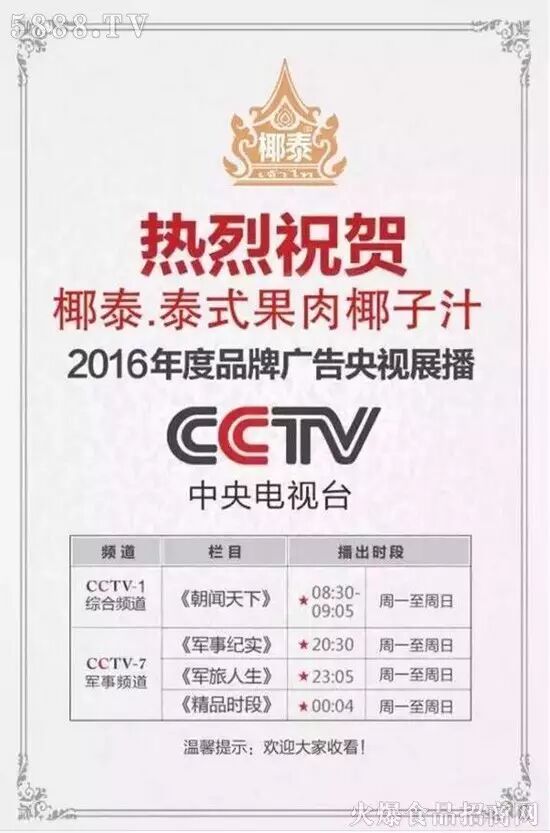 面对全国经销商朋友们的热情召唤,2016年椰泰椰汁的电视广告投放也是惊喜不断,先是安徽公共频道上线,接着登上湖南电视剧等频道,现在椰泰椰汁央视广告开启了。椰泰椰汁将于5月17日起在央视CCTV1和CCTV7两个频道进行不同时间段的广告播放,敬请关注留意!
