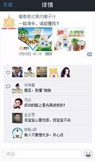 由于椰泰椰汁刚开始玩朋友圈不久,而且为人比较低调,所以朋友圈较少。小编只是截取了她一部分的朋友圈,但小编知道很多人都看好她。椰泰椰汁是一个很棒很努力很有潜力的人,她是要成为第一生榨椰子汁的人!