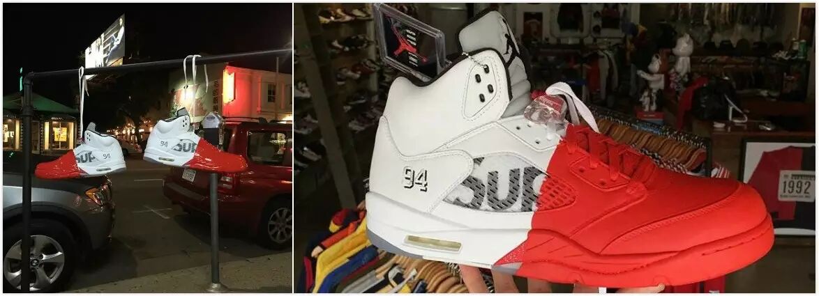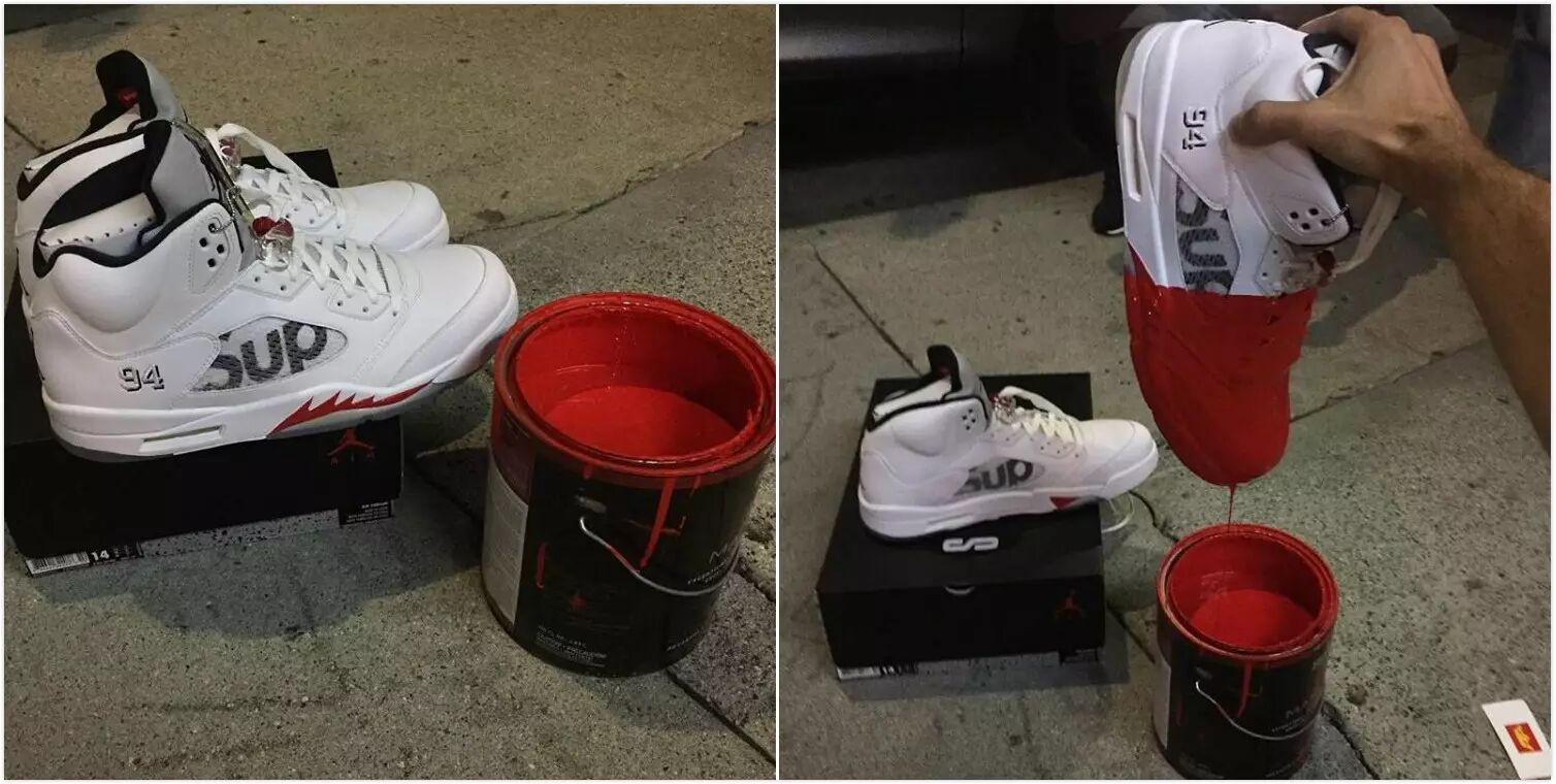 做法简单,所需道具:Supreme x Air Jordan 5、一桶油漆、一颗强大的心脏,道具到位后,我们只需喊出口号“泡一泡”就可以了。
