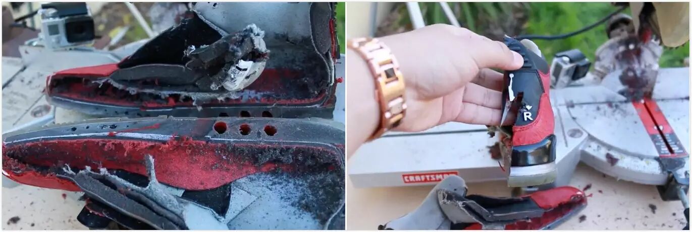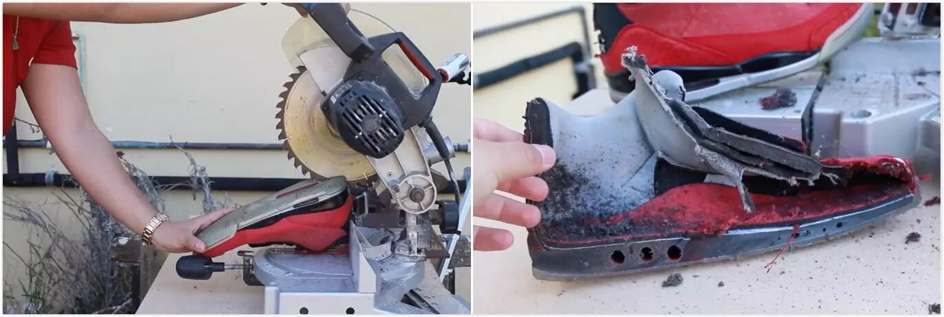 他竟然用一台切割机把鞋子硬生生的切开两半,场面真的太“血腥”了!