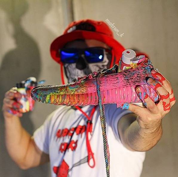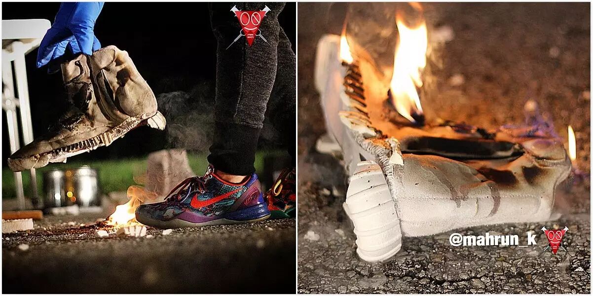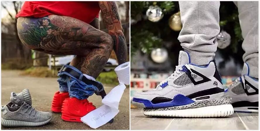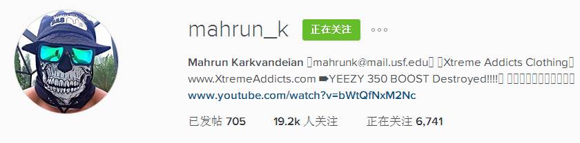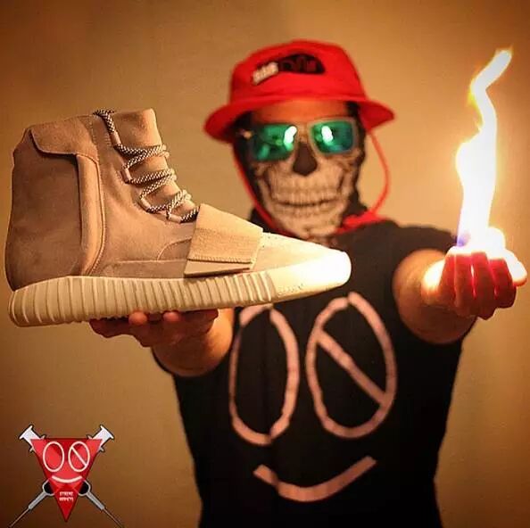 这位戴面具的哥们就是Mahrun,为了表示对Yeezy Boost的不满(有人说是因为他不喜欢侃爷),他对Yeezy Boost这系列鞋款做出了很多偏激的行为↓
