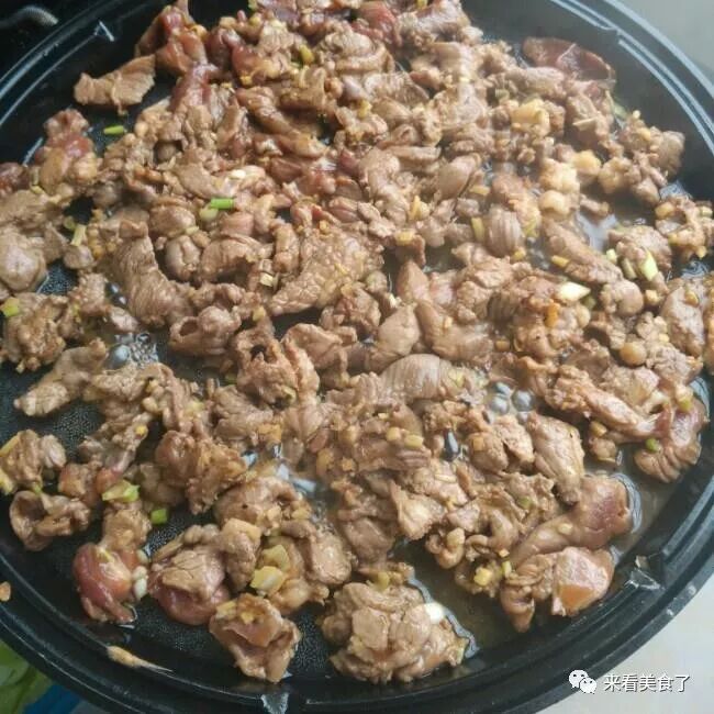 2、电饼铛热好,倒入适量的油,油热好后,放入腌好的羊肉,大概3到4分钟后,羊肉出水后,盖上盖继续加热