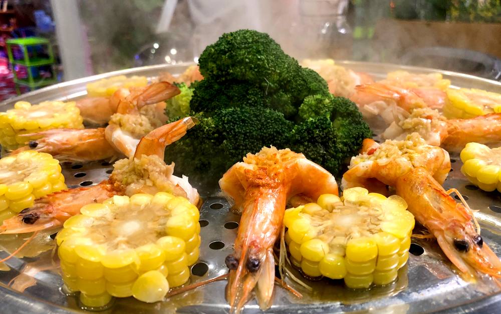 如意开边虾 糯玉米 西兰花
