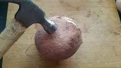 4.在椰子壳的顶端打开一个小口,倒出一半椰汁。