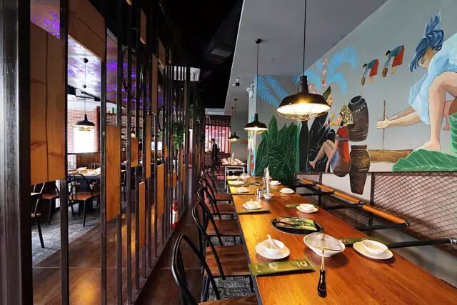 店内氛围也很海南大片的芭蕉叶 ,搭配着生动的海南浮世绘跃然墙上,长条桌、圆桌、半封闭式包厢配合时髦又清新的软装风格,让人觉得休闲、轻松,是亲友聚餐、情侣约会的绝佳去处哦!