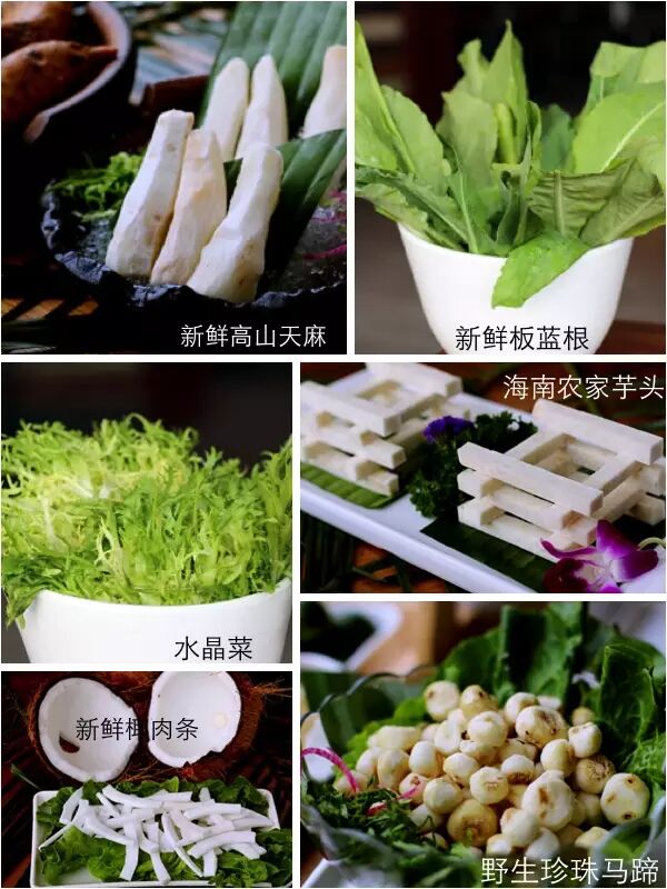 ◢值得推荐的是海南特有的山珍野菜:水晶菜、新鲜板蓝根、新鲜虫草花、农家芋头、野生珍珠马蹄、新鲜高山天麻。