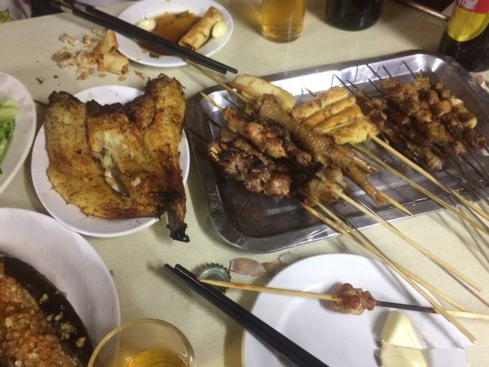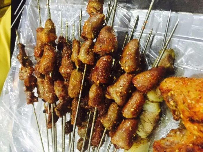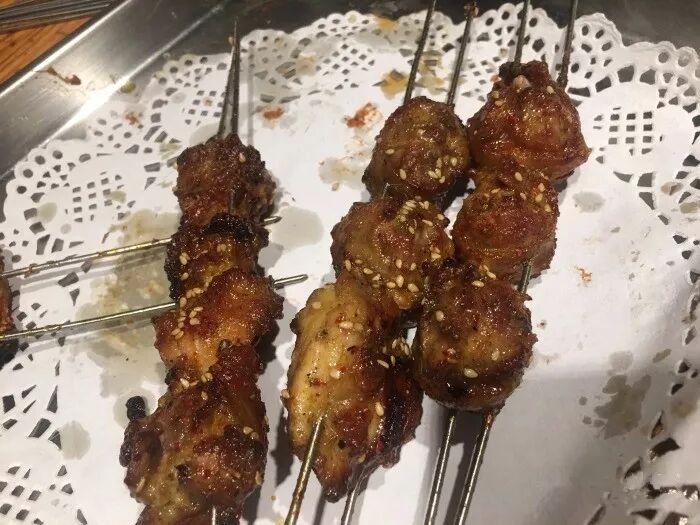 “小白脸”也是一家二十多年的老店了。这里最受吃货欢迎的是烤鸡头、烤鸡脖子、蜜汁鸡翅、糖醋排骨串和烤五花肉。