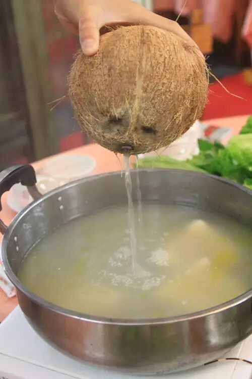 家庭式熬的汤底,采用是海南老椰,而且即场为你开椰子,倒椰子水,煲滚后你会闻到清香扑鼻的椰子香。