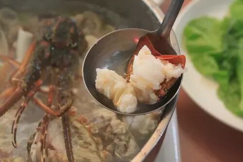 这个时候主菜要出场啦——澳洲青龙虾,芝士焗龙虾吃得多啦,其实这样放入椰子汤底白灼一样好好吃,弹口鲜甜,必试!!!