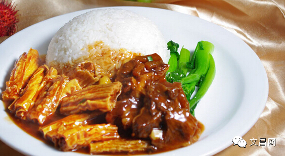 海南牛腩饭是出现在海南最早的套餐之一。与其他地方的牛腩饭不同,海南牛腩饭有自己的特色:清淡、鲜甜、简单、朴素。牛腩饭的白米饭制作起来可不简单。首先必须挑选海南产的隔年陈米,所有选出的米在煮之前都必须用油炒过。简单的米饭搭配秘制的牛腩,每一粒米都透着牛腩的清香味,吃起来略有点咸味,但味道极淡。这样的饭、汤跟牛腩放在一起,简直是绝配。亲,还记得小时候缠着爸妈要去吃牛腩饭的场景吗?