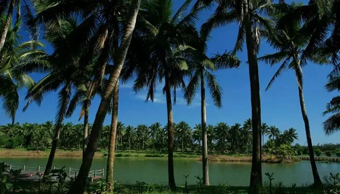 根据研究表明,椰林空气中的负离子含量是城市市区空气中负离子含量的400倍,徜徉在这翠绿欲滴的森林中,呼吸着纯净的空气,使人神清气爽,宜寿延年。