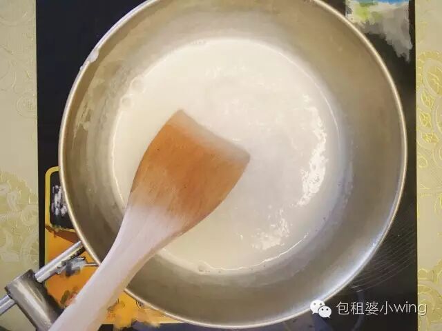 另起一锅倒入椰浆还有剩下的白砂糖和吉利丁粉,不断搅拌溶解,煮开后同样晾凉待用。