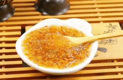 桂花酱可以加冰水冲饮,也可以涂面包馒头,可以沾梅、桃、草莓,也可以当菜的佐料。