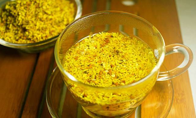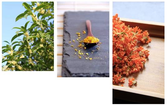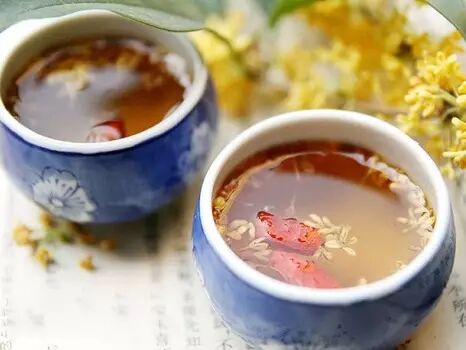 制法:采摘花瓣微张的新鲜桂花,以3:1的比例放在茶罐里,茶叶会吸取桂花的香气,等到桂花自然干去便成了桂花茶。