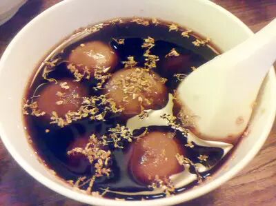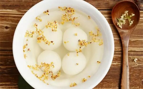 制法:糯米粉加水,和到像耳垂一样的软度。糖桂花加白糖、熟芝麻拌匀。将桂花馅包入糯米粉中,做成汤圆。用小火煮熟(因为汤圆很软,火太大汤圆容易煮破)。