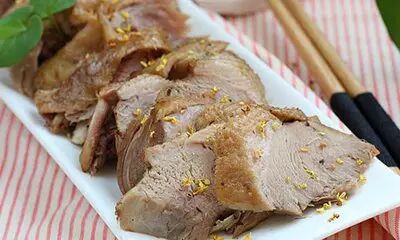 加入料酒和盐,开盖维持火力5分钟后,加盖转文火继续煲1个半小时。时间到,撇去漂浮的调料和浮油,桂花鸭就做好了。鸭肉会带有桂花的香气,汤也很鲜美。