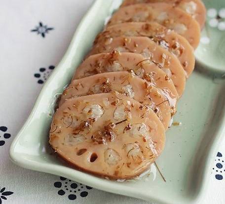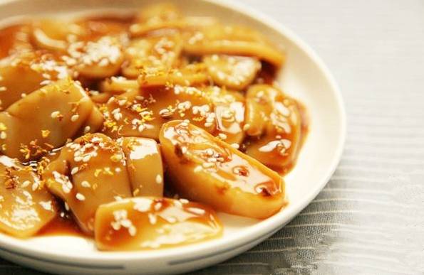 3.捞起过凉,摆入盘里,浇上桂花酱即可。