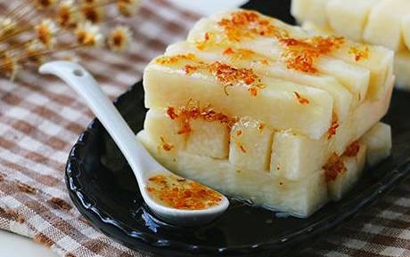 制法:先将糯、粳米粉筛一下,加白砂糖,用清水揉拌均匀。将拌透揉透的糕粉上笼蒸约一刻钟,然后将糕粉用湿纱布包住,不断翻揿、揉捏,直至表面光滑,糕粉细腻为止。再将糕粉揿平,拉成长条,抹上植物油,撒上桂花,切成长方块即成。