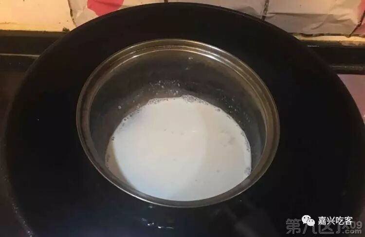 然后把椰浆、淡奶油、一半的糖混合放入锅里,